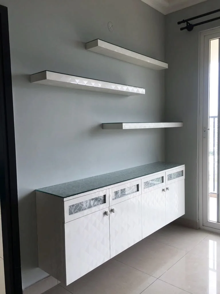 The living area extended to the dining, so instead of doing one large chandelier, we custom designed the hanging pendant lights for the dining area to tie in with the glass detail panelling designed on the wall.