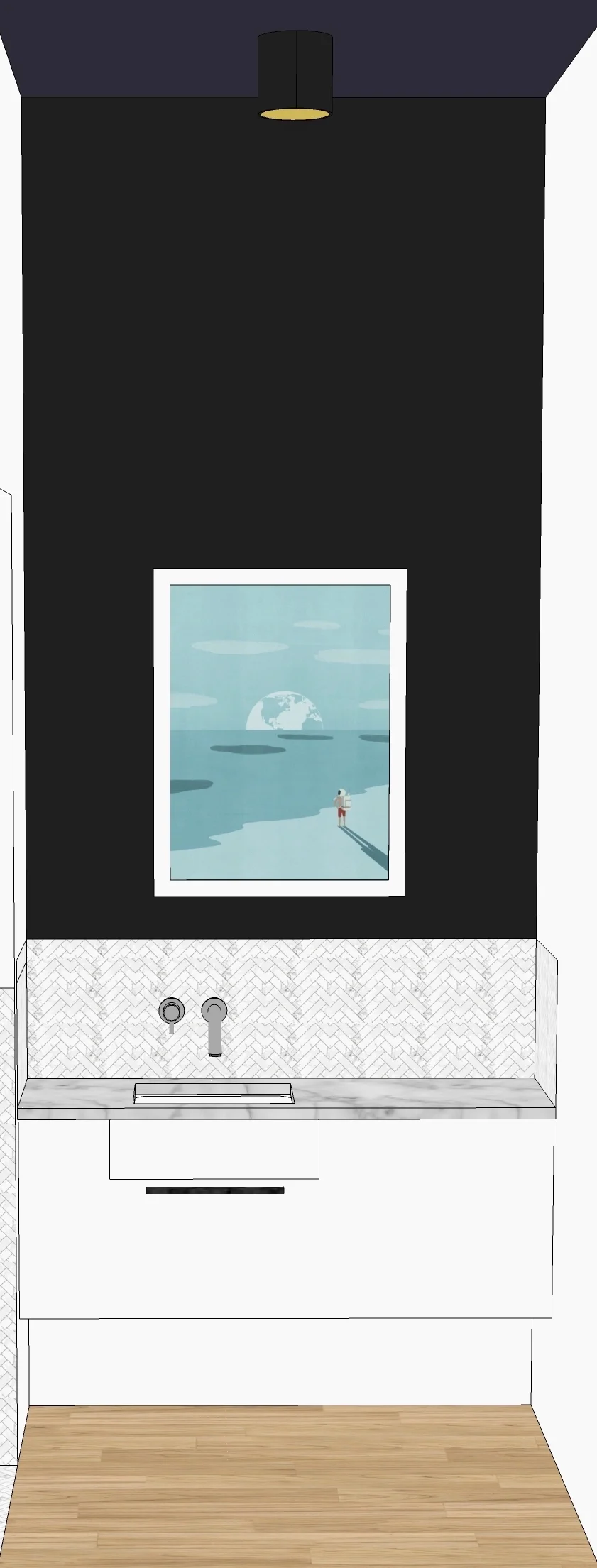 Our team did brilliant work on the custom kitchen. We worked with 2 mid tone blues for detailing all the cabinets. We brought up the white marble effect with warm veining up from the counter tops to the backsplash, creating a backdrop for styling with the top shelves.